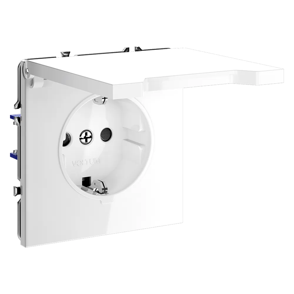Розетка VOLTUM S70 с заземлением и защитными шторками и откидной крышкой  — это решение максимальной безопасности и эстетики для современного интерьера. Идеально подходит для детских комнат, ванных, прихожих, кухонь и уличных зон под навесом, где важна защита от пыли, брызг и случайного контакта с токоведущими частями.